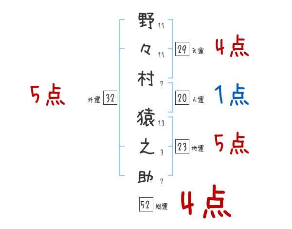 外運![]() | 野々村猿之助さんの外運は32画の5つ星!柔軟性があり成功する。チャンスが多く金運が良い。 生活面を象徴する運勢です。外部から受ける影響力を表し、結婚運、家庭運や職場、環境への順応性を表します。 |