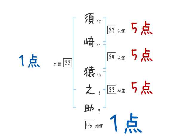 天運![]() | 須﨑猿之助さんの天運は23画の5つ星!想像力に優れ活力がある。一代で成功し名誉を手に入れる。 家系が持つ宿命的な運勢を表します。祖先から受け継いだ苗字ですので自分の力が及びません。家柄を象徴します。 |