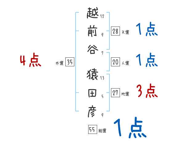 外運![]() | 越前谷猿田彦さんの外運は35画の4つ星!温厚な性格で感受性が高い。穏和な性格で人望が厚い。 生活面を象徴する運勢です。外部から受ける影響力を表し、結婚運、家庭運や職場、環境への順応性を表します。 |