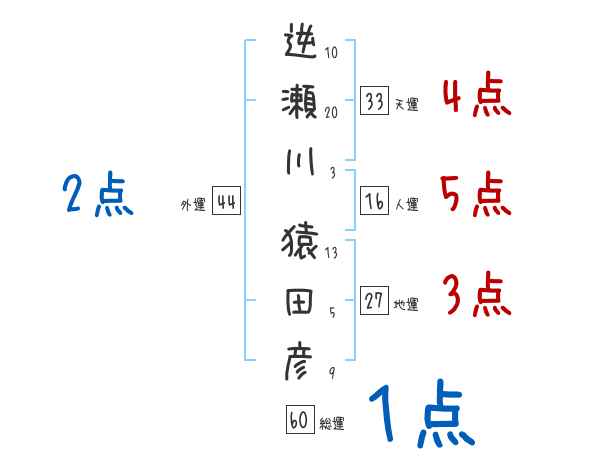 天運![]() | 逆瀬川猿田彦さんの天運は33画の4つ星!権力志向でプライドが高い。勇気があり運を切り開き成功する。 家系が持つ宿命的な運勢を表します。祖先から受け継いだ苗字ですので自分の力が及びません。家柄を象徴します。 |