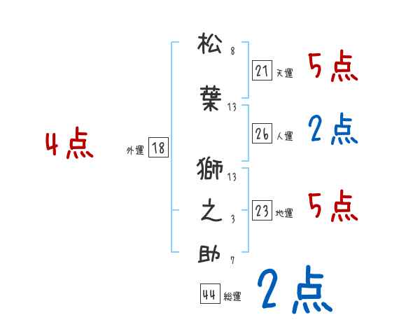 総運![]() | 松葉獅之助さんの総運は44画の2つ星!誠実で慎重な性格。物事を考えすぎないように注意しましょう。 あなたの人生を表す1番重要な運勢です。生涯を通じて影響する総合運となり、主に50歳以降の晩年期に影響を及ぼします。 |