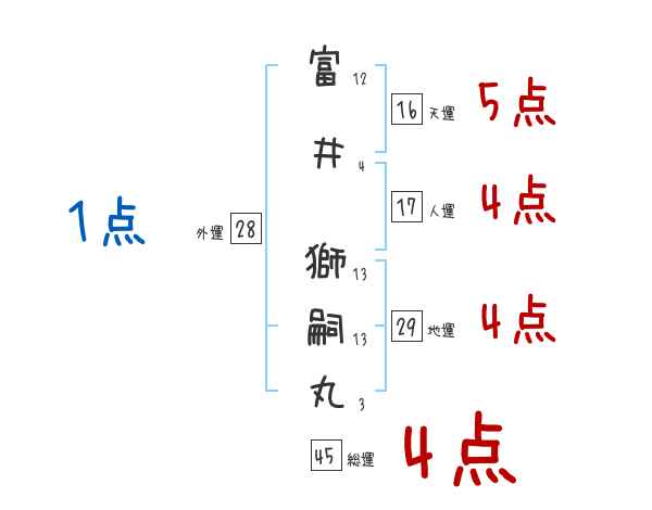 天運![]() | 富井獅嗣丸さんの天運は16画の5つ星!人望が厚く大きく発展する。逆転成功が見える。 家系が持つ宿命的な運勢を表します。祖先から受け継いだ苗字ですので自分の力が及びません。家柄を象徴します。 |