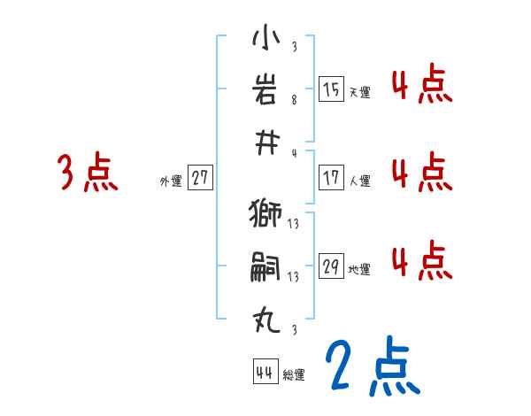 総運![]() | 小岩井獅嗣丸さんの総運は44画の2つ星!誠実で慎重な性格。物事を考えすぎないように注意しましょう。 あなたの人生を表す1番重要な運勢です。生涯を通じて影響する総合運となり、主に50歳以降の晩年期に影響を及ぼします。 |