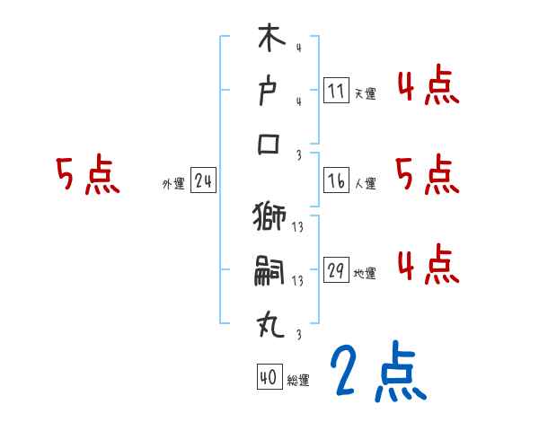 人運![]() | 木戸口獅嗣丸さんの人運は16画の5つ星!人望が厚く大きく発展する。逆転成功が見える。 性格や才能などを表す2番目に重要な運勢です。人間関係や協調性、社会的な成功に影響します。主に20歳から50歳ぐらいまでの中年期の運勢を表します。 |