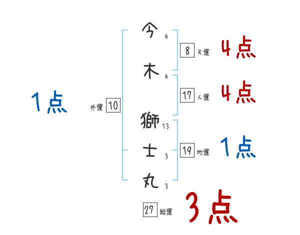 天運![]() | 今木獅士丸さんの天運は8画の4つ星!勤勉家。根気強く努力し成功する。忍耐力がある。 家系が持つ宿命的な運勢を表します。祖先から受け継いだ苗字ですので自分の力が及びません。家柄を象徴します。 |