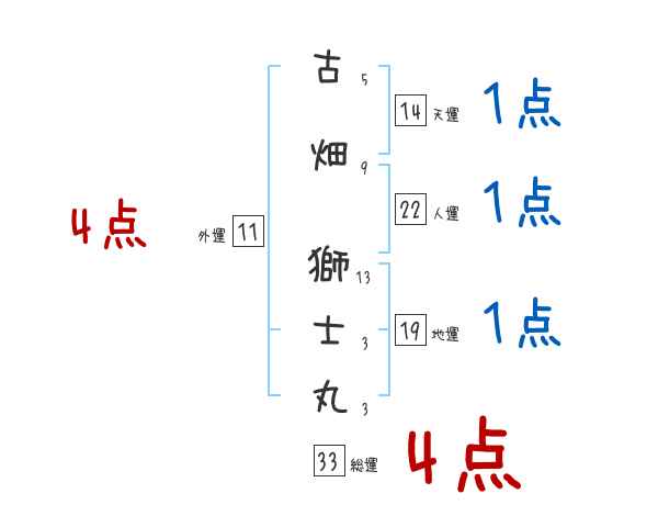 外運![]() | 古畑獅士丸さんの外運は11画の4つ星!着実に富や地位を得る幸運な人生。 生活面を象徴する運勢です。外部から受ける影響力を表し、結婚運、家庭運や職場、環境への順応性を表します。 |
