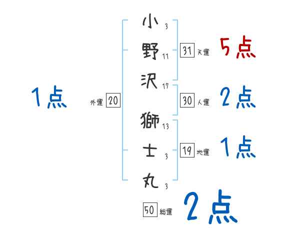 総運![]() | 小野沢獅士丸さんの総運は50画の2つ星!浮き沈みが激しく不安定。しりすぼみに衰退しやすいので注意しましょう。 あなたの人生を表す1番重要な運勢です。生涯を通じて影響する総合運となり、主に50歳以降の晩年期に影響を及ぼします。 |