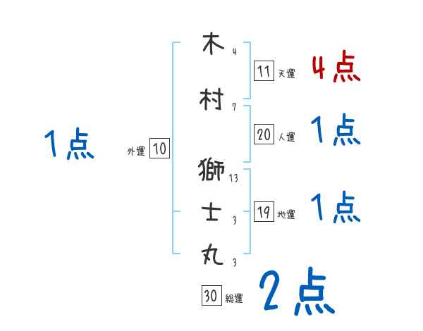 天運![]() | 木村獅士丸さんの天運は11画の4つ星!着実に富や地位を得る幸運な人生。 家系が持つ宿命的な運勢を表します。祖先から受け継いだ苗字ですので自分の力が及びません。家柄を象徴します。 |