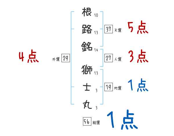 総運![]() | 根路銘獅士丸さんの総運は56画の1つ星!消極的で無気力になりがち。誠実な気持ちが必要でしょう。 あなたの人生を表す1番重要な運勢です。生涯を通じて影響する総合運となり、主に50歳以降の晩年期に影響を及ぼします。 |