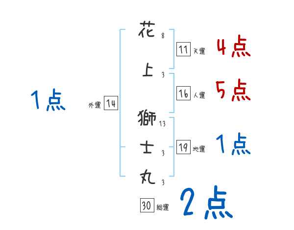天運![]() | 花上獅士丸さんの天運は11画の4つ星!着実に富や地位を得る幸運な人生。 家系が持つ宿命的な運勢を表します。祖先から受け継いだ苗字ですので自分の力が及びません。家柄を象徴します。 |