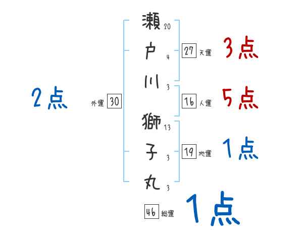 総運![]() | 瀬戸川獅子丸さんの総運は46画の1つ星!迷走することが多く苦労するかも。目先のことにとらわれないように。 あなたの人生を表す1番重要な運勢です。生涯を通じて影響する総合運となり、主に50歳以降の晩年期に影響を及ぼします。 |