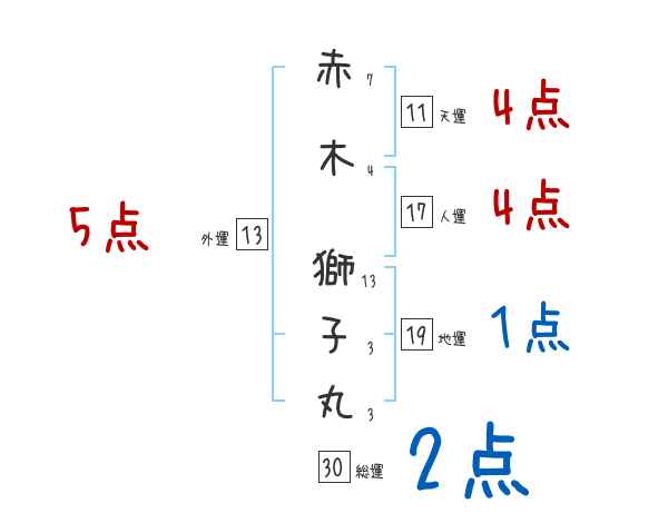 総運![]() | 赤木獅子丸さんの総運は30画の2つ星!浮き沈みの激しさに注意しましょう。 あなたの人生を表す1番重要な運勢です。生涯を通じて影響する総合運となり、主に50歳以降の晩年期に影響を及ぼします。 |