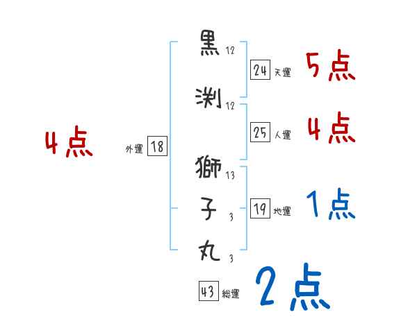 天運![]() | 黒渕獅子丸さんの天運は24画の5つ星!家庭運が良く順調な人生。金運にも恵まれる。 家系が持つ宿命的な運勢を表します。祖先から受け継いだ苗字ですので自分の力が及びません。家柄を象徴します。 |