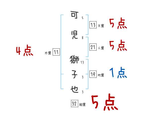 総運![]() | 可児獅子也さんの総運は32画の5つ星!柔軟性があり成功する。チャンスが多く金運が良い。 あなたの人生を表す1番重要な運勢です。生涯を通じて影響する総合運となり、主に50歳以降の晩年期に影響を及ぼします。 |