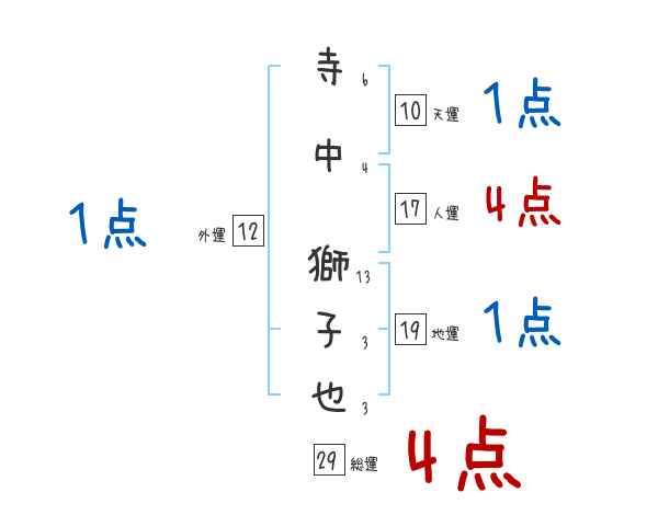 天運![]() | 寺中獅子也さんの天運は10画の1つ星!不安を感じやすい傾向。ストレスを抱えないように注意しましょう。 家系が持つ宿命的な運勢を表します。祖先から受け継いだ苗字ですので自分の力が及びません。家柄を象徴します。 |