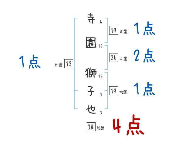 天運![]() | 寺園獅子也さんの天運は19画の1つ星!優れた才能を持ちますが、協調性が足りないことも。周りの人と協力する事を意識しましょう。 家系が持つ宿命的な運勢を表します。祖先から受け継いだ苗字ですので自分の力が及びません。家柄を象徴します。 |
