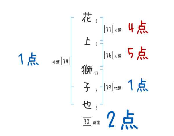 地運![]() | 花上獅子也さんの地運は19画の1つ星!優れた才能を持ちますが、協調性が足りないことも。周りの人と協力する事を意識しましょう。 個性を表す基礎的な運勢です。性格形成や対人関係、行動力など家庭環境に影響されます。主に誕生してから20歳くらいまでの若年期の運勢を表します。 |