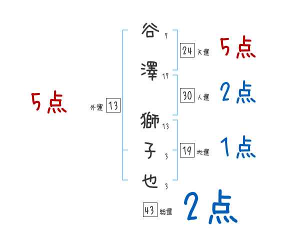 | 天運  | 谷澤獅子也さんの天運は24画の5つ星!家庭運が良く順調な人生。金運にも恵まれる。家系が持つ宿命的な運勢を表します。祖先から受け継いだ苗字ですので自分の力が及びません。家柄を象徴します。 |