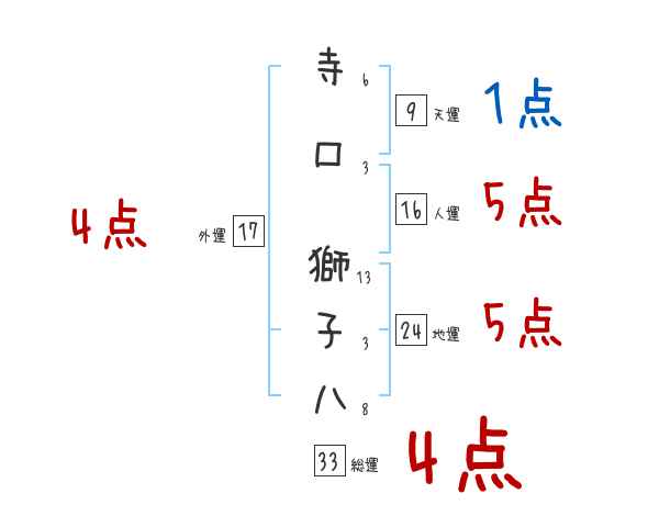 天運![]() | 寺口獅子八さんの天運は9画の1つ星!消極的で才能を発揮することが苦手なことも。周りの意見に耳を傾けましょう。 家系が持つ宿命的な運勢を表します。祖先から受け継いだ苗字ですので自分の力が及びません。家柄を象徴します。 |