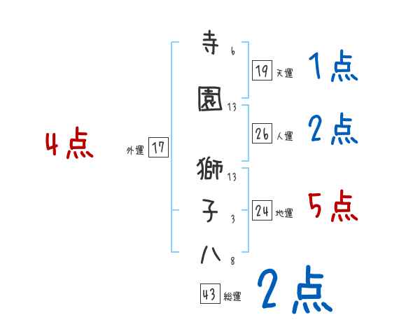 天運![]() | 寺園獅子八さんの天運は19画の1つ星!優れた才能を持ちますが、協調性が足りないことも。周りの人と協力する事を意識しましょう。 家系が持つ宿命的な運勢を表します。祖先から受け継いだ苗字ですので自分の力が及びません。家柄を象徴します。 |