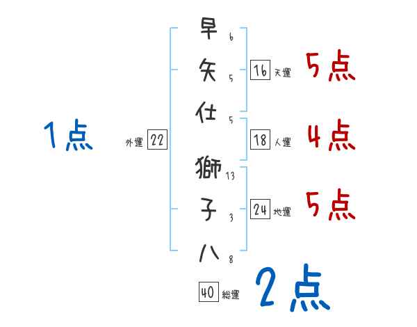 天運![]() | 早矢仕獅子八さんの天運は16画の5つ星!人望が厚く大きく発展する。逆転成功が見える。 家系が持つ宿命的な運勢を表します。祖先から受け継いだ苗字ですので自分の力が及びません。家柄を象徴します。 |