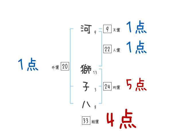 天運![]() | 河獅子八さんの天運は9画の1つ星!消極的で才能を発揮することが苦手なことも。周りの意見に耳を傾けましょう。 家系が持つ宿命的な運勢を表します。祖先から受け継いだ苗字ですので自分の力が及びません。家柄を象徴します。 |