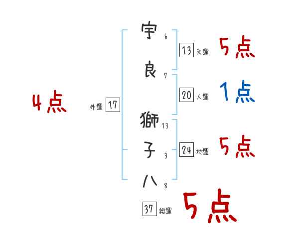 総運![]() | 宇良獅子八さんの総運は37画の5つ星!努力家で順応性に優れる。現実的な考え方ができ忠実に物事をこなす。 あなたの人生を表す1番重要な運勢です。生涯を通じて影響する総合運となり、主に50歳以降の晩年期に影響を及ぼします。 |