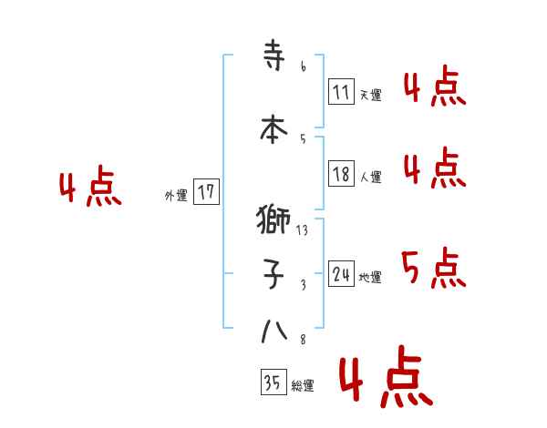 地運![]() | 寺本獅子八さんの地運は24画の5つ星!家庭運が良く順調な人生。金運にも恵まれる。 個性を表す基礎的な運勢です。性格形成や対人関係、行動力など家庭環境に影響されます。主に誕生してから20歳くらいまでの若年期の運勢を表します。 |