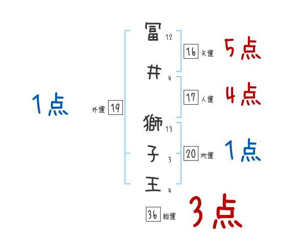 天運![]() | 冨井獅子王さんの天運は16画の5つ星!人望が厚く大きく発展する。逆転成功が見える。 家系が持つ宿命的な運勢を表します。祖先から受け継いだ苗字ですので自分の力が及びません。家柄を象徴します。 |