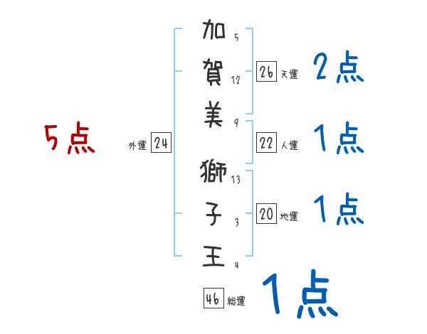 外運![]() | 加賀美獅子王さんの外運は24画の5つ星!家庭運が良く順調な人生。金運にも恵まれる。 生活面を象徴する運勢です。外部から受ける影響力を表し、結婚運、家庭運や職場、環境への順応性を表します。 |
