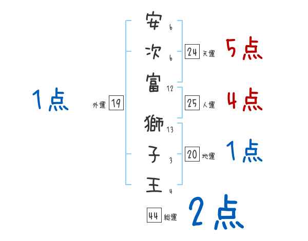 天運![]() | 安次富獅子王さんの天運は24画の5つ星!家庭運が良く順調な人生。金運にも恵まれる。 家系が持つ宿命的な運勢を表します。祖先から受け継いだ苗字ですので自分の力が及びません。家柄を象徴します。 |