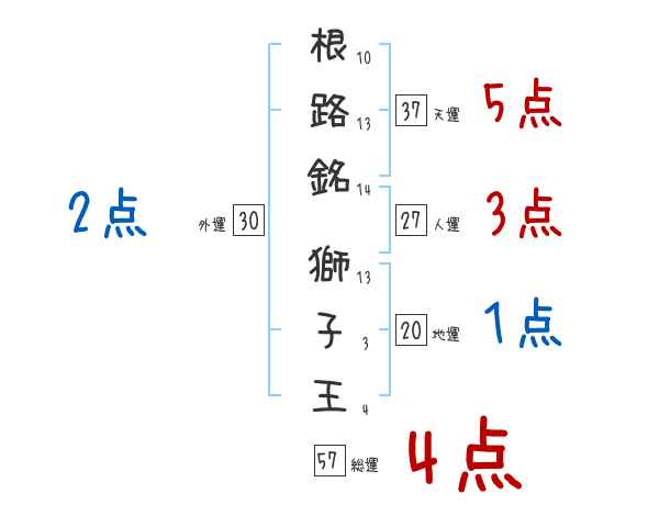 総運![]() | 根路銘獅子王さんの総運は57画の4つ星!向上心があり人望がある。地位を得る。 あなたの人生を表す1番重要な運勢です。生涯を通じて影響する総合運となり、主に50歳以降の晩年期に影響を及ぼします。 |