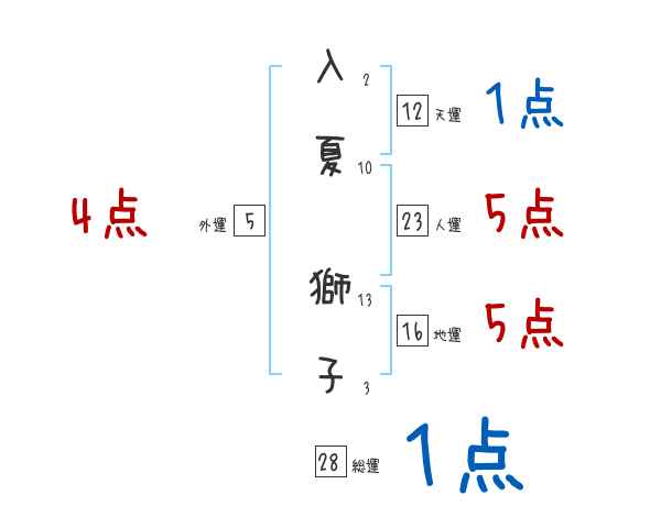 天運![]() | 入夏獅子さんの天運は12画の1つ星!簡単な失敗で諦めてしまいやすいかも。着実に行動すると良いでしょう。 家系が持つ宿命的な運勢を表します。祖先から受け継いだ苗字ですので自分の力が及びません。家柄を象徴します。 |
