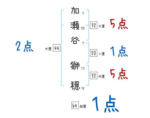 天運![]() | 加瀬谷獅穏さんの天運は32画の5つ星!柔軟性があり成功する。チャンスが多く金運が良い。 家系が持つ宿命的な運勢を表します。祖先から受け継いだ苗字ですので自分の力が及びません。家柄を象徴します。 |