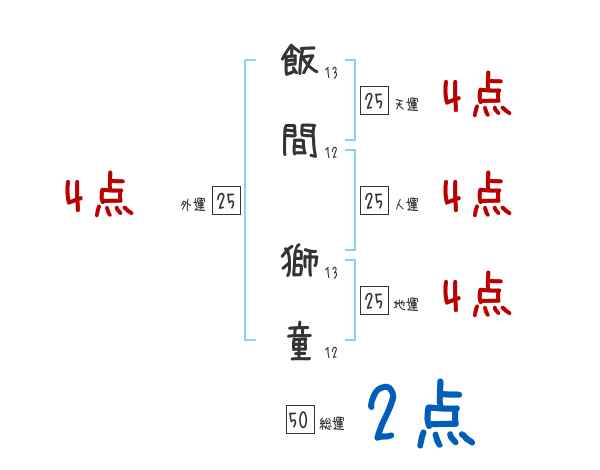 人運![]() | 飯間獅童さんの人運は25画の4つ星!個性があり才能があふれる。強運の持ち主で発展する。 性格や才能などを表す2番目に重要な運勢です。人間関係や協調性、社会的な成功に影響します。主に20歳から50歳ぐらいまでの中年期の運勢を表します。 |