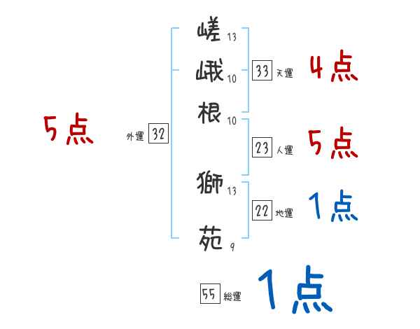 人運![]() | 嵯峨根獅苑さんの人運は23画の5つ星!想像力に優れ活力がある。一代で成功し名誉を手に入れる。 性格や才能などを表す2番目に重要な運勢です。人間関係や協調性、社会的な成功に影響します。主に20歳から50歳ぐらいまでの中年期の運勢を表します。 |