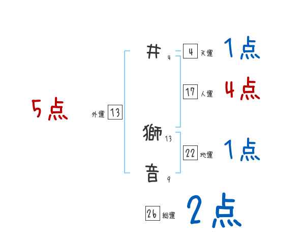 総運![]() | 井獅音さんの総運は26画の2つ星!波瀾万丈かも。信頼できる人を大事にしましょう。 あなたの人生を表す1番重要な運勢です。生涯を通じて影響する総合運となり、主に50歳以降の晩年期に影響を及ぼします。 |
