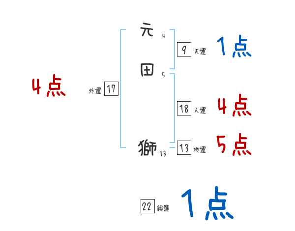 総運![]() | 元田獅さんの総運は22画の1つ星!努力することが苦手ないっぽう手先が器用。芸術性にも優れる。 あなたの人生を表す1番重要な運勢です。生涯を通じて影響する総合運となり、主に50歳以降の晩年期に影響を及ぼします。 |