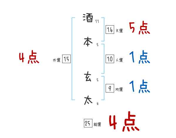 天運![]() | 酒本玄太さんの天運は16画の5つ星!人望が厚く大きく発展する。逆転成功が見える。 家系が持つ宿命的な運勢を表します。祖先から受け継いだ苗字ですので自分の力が及びません。家柄を象徴します。 |