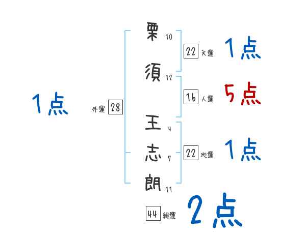 人運![]() | 栗須王志朗さんの人運は16画の5つ星!人望が厚く大きく発展する。逆転成功が見える。 性格や才能などを表す2番目に重要な運勢です。人間関係や協調性、社会的な成功に影響します。主に20歳から50歳ぐらいまでの中年期の運勢を表します。 |