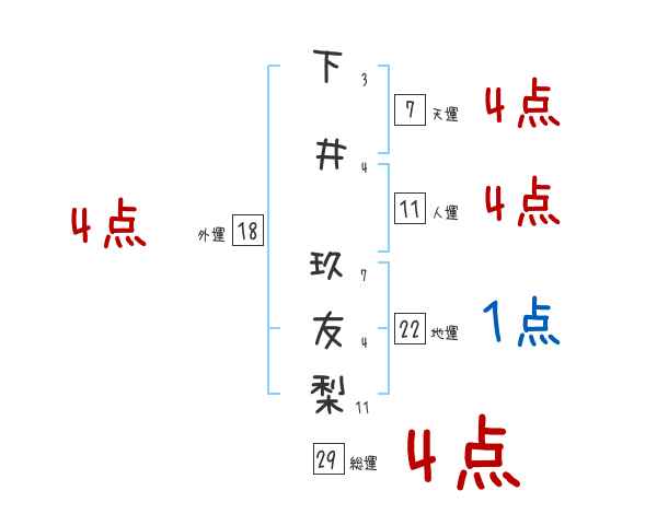 天運![]() | 下井玖友梨さんの天運は7画の4つ星!強い意志や信念を持ち独立心が強い。自立する。 家系が持つ宿命的な運勢を表します。祖先から受け継いだ苗字ですので自分の力が及びません。家柄を象徴します。 |