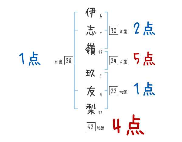 外運![]() | 伊志嶺玖友梨さんの外運は28画の1つ星!家庭環境に注意。スポーツで活躍できる能力があるかも。 生活面を象徴する運勢です。外部から受ける影響力を表し、結婚運、家庭運や職場、環境への順応性を表します。 |
