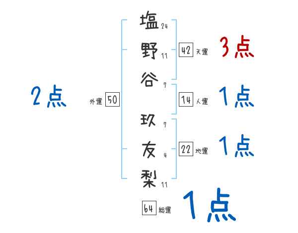 地運![]() | 塩野谷玖友梨さんの地運は22画の1つ星!努力することが苦手ないっぽう手先が器用。芸術性にも優れる。 個性を表す基礎的な運勢です。性格形成や対人関係、行動力など家庭環境に影響されます。主に誕生してから20歳くらいまでの若年期の運勢を表します。 |