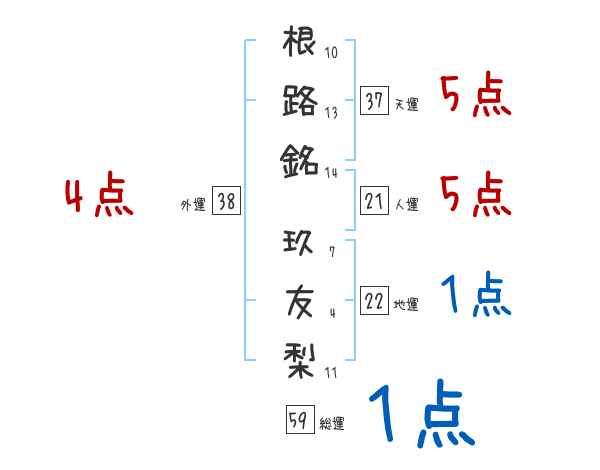 人運![]() | 根路銘玖友梨さんの人運は21画の5つ星!統率力がある。独立し成功する。名誉を手に入れる。 性格や才能などを表す2番目に重要な運勢です。人間関係や協調性、社会的な成功に影響します。主に20歳から50歳ぐらいまでの中年期の運勢を表します。 |