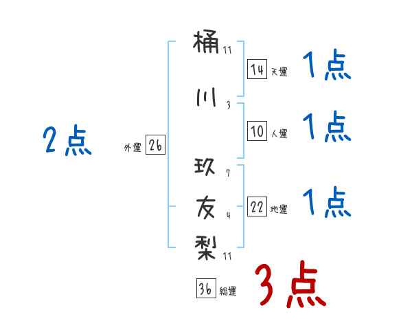 外運![]() | 桶川玖友梨さんの外運は26画の2つ星!波瀾万丈かも。信頼できる人を大事にしましょう。 生活面を象徴する運勢です。外部から受ける影響力を表し、結婚運、家庭運や職場、環境への順応性を表します。 |
