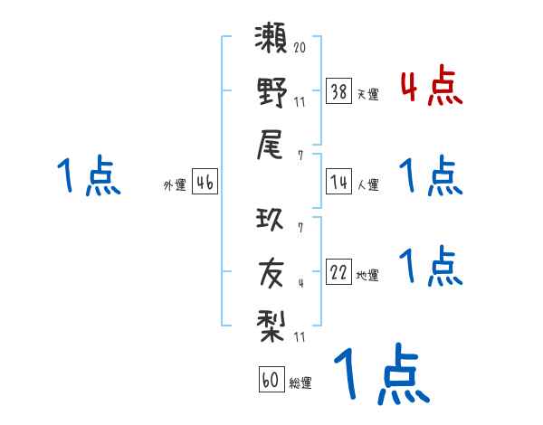 総運![]() | 瀬野尾玖友梨さんの総運は60画の1つ星!悲観的で迷いやすい。波乱が多く損をしないように。 あなたの人生を表す1番重要な運勢です。生涯を通じて影響する総合運となり、主に50歳以降の晩年期に影響を及ぼします。 |