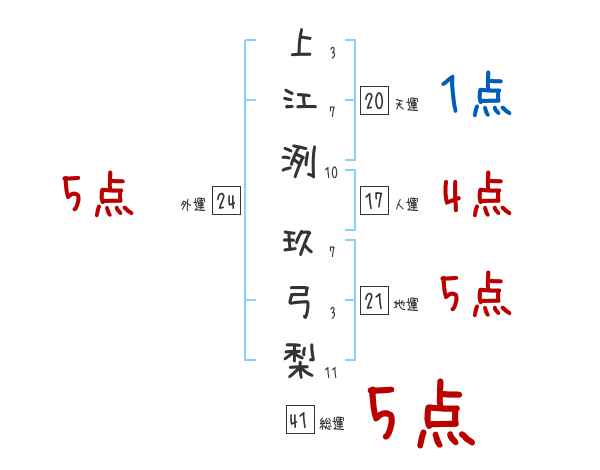 外運![]() | 上江洌玖弓梨さんの外運は24画の5つ星!家庭運が良く順調な人生。金運にも恵まれる。 生活面を象徴する運勢です。外部から受ける影響力を表し、結婚運、家庭運や職場、環境への順応性を表します。 |