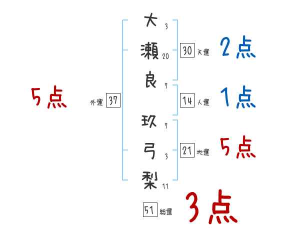 総運![]() | 大瀬良玖弓梨さんの総運は51画の3つ星!変化が激しく、危険に注意。堅実な性格。 あなたの人生を表す1番重要な運勢です。生涯を通じて影響する総合運となり、主に50歳以降の晩年期に影響を及ぼします。 |