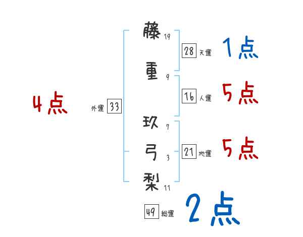 人運![]() | 藤重玖弓梨さんの人運は16画の5つ星!人望が厚く大きく発展する。逆転成功が見える。 性格や才能などを表す2番目に重要な運勢です。人間関係や協調性、社会的な成功に影響します。主に20歳から50歳ぐらいまでの中年期の運勢を表します。 |