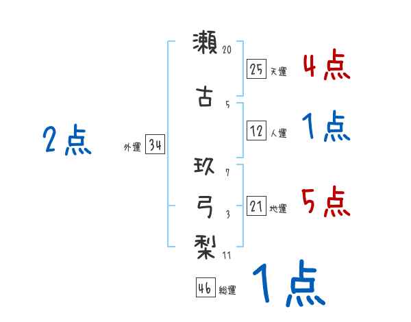 天運![]() | 瀬古玖弓梨さんの天運は25画の4つ星!個性があり才能があふれる。強運の持ち主で発展する。 家系が持つ宿命的な運勢を表します。祖先から受け継いだ苗字ですので自分の力が及びません。家柄を象徴します。 |